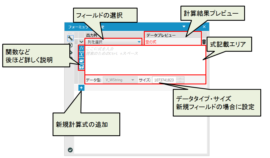 注意既存フィールドではデータタイプ・サイズの変更ができない為、関数を用いてのタイプの変更や、計算結果でサイズをオーバーすると、正しくない結果となる可能性があるのでご注意ください。