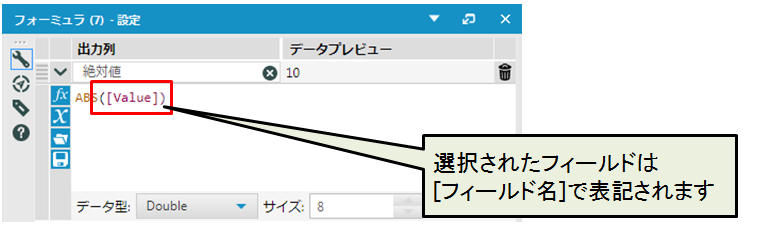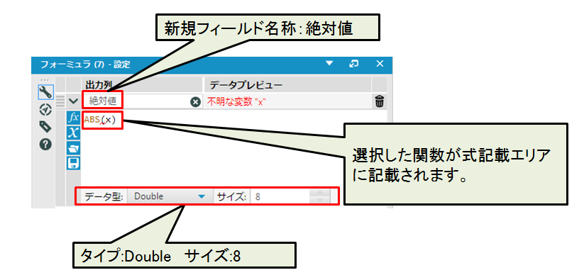 設定値は新規フィールドとして名称を「絶対値」と入力します。データタイプは数値型です。今回は「Double(浮動小数点型)」とします。サイズは数値の場合は自動入力されます。