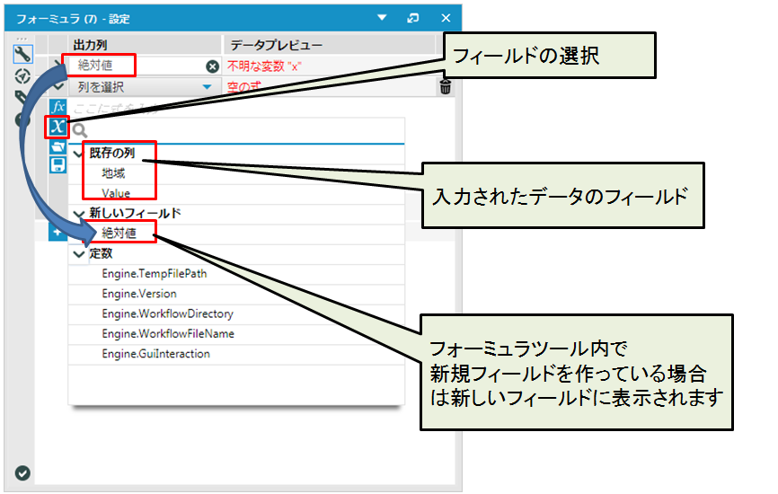 ではサンプルに戻ります。フィールドを選択し、xの部分に記載するとプレビューに結果が表示されます。