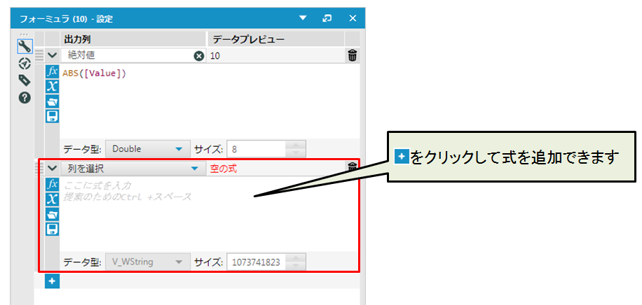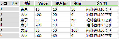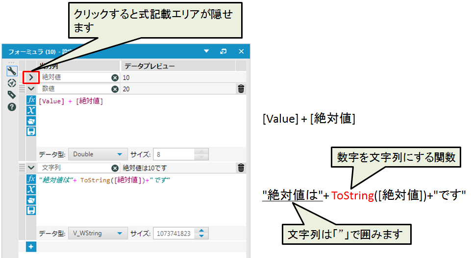 もうひとつは、[文字列]というV_WString型の新規フィールドを作成し、計算式としては「"絶対値は"+ToString([絶対値])+"です"」とします。