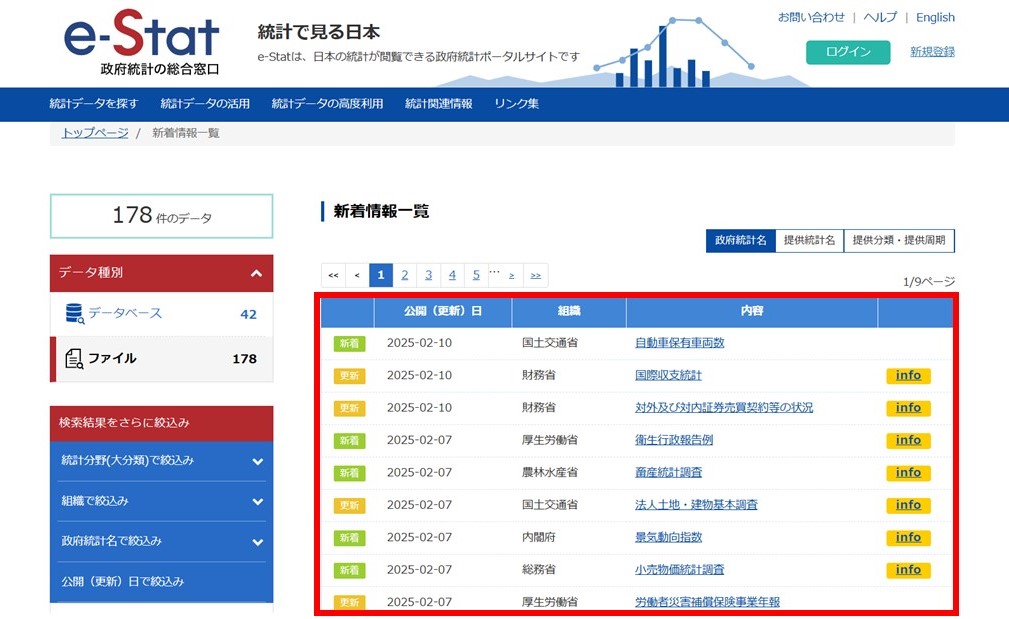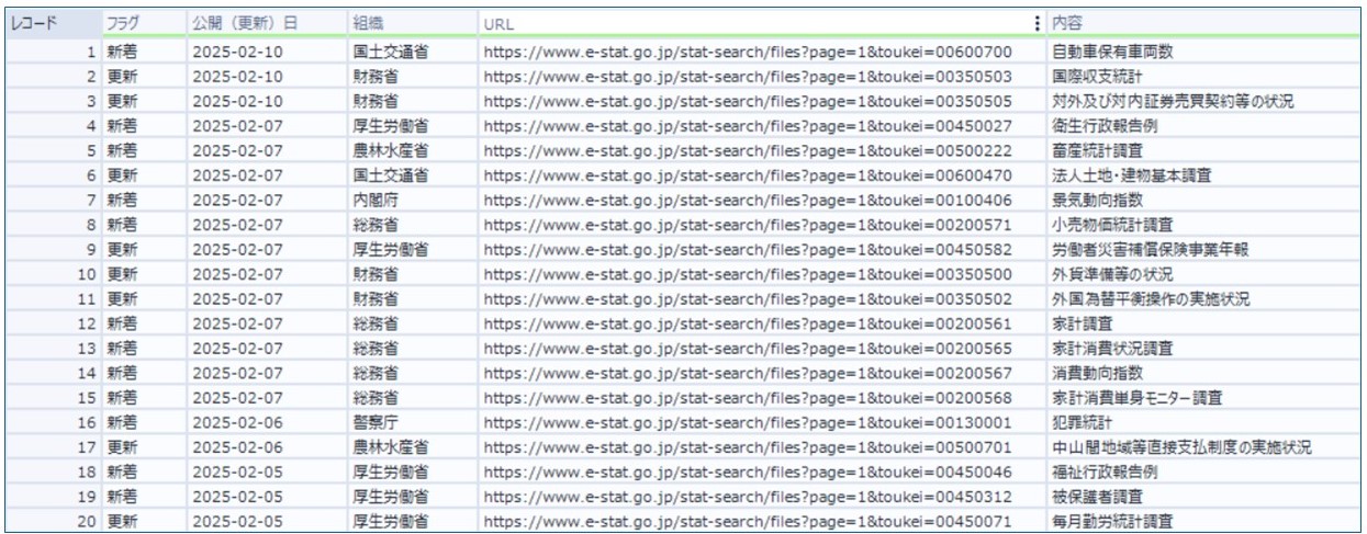 そうしますと、e-Statの「新着情報一覧」ページから、新たに追加・更新されたデータテーブルを抽出することができました。