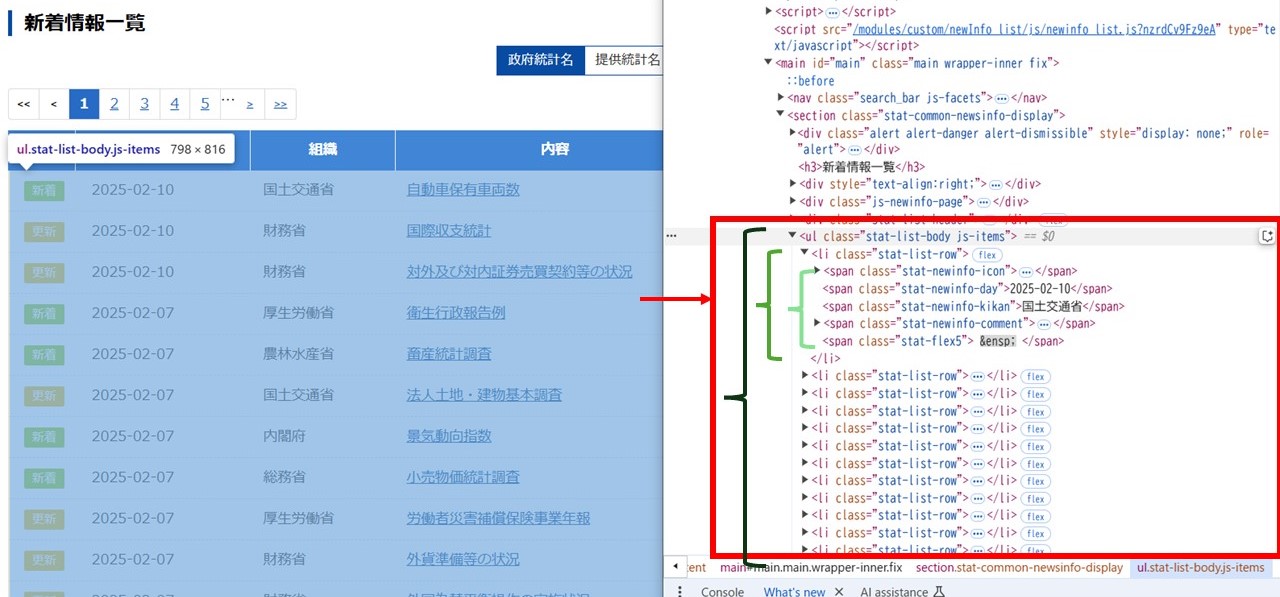 まず、Webスクレイピングで最も時間がかかる部分として、抽出したいデータを取得するために「新着情報一覧」テーブルのHTML構造を分析する必要があります。