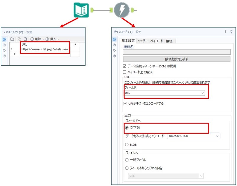 次に、ダウンロードツール でURLを指定し、出力形式を「文字列」に設定します。