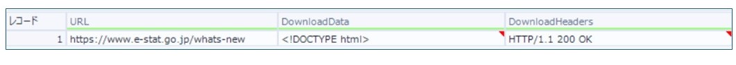 このワークフローを実行し、データを正常に取得できた場合、DownloadHeaders フィールドに 200 の値が入り、DownloadData フィールドに HTMLコード が保存されていることが確認できます。