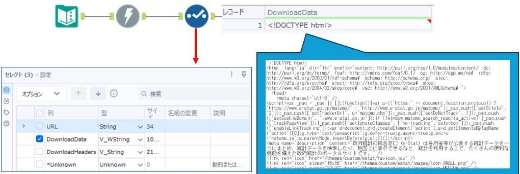 この後、使用するデータは DownloadData フィールドの値なので、セレクトツール を使用して他のフィールドを削除します。