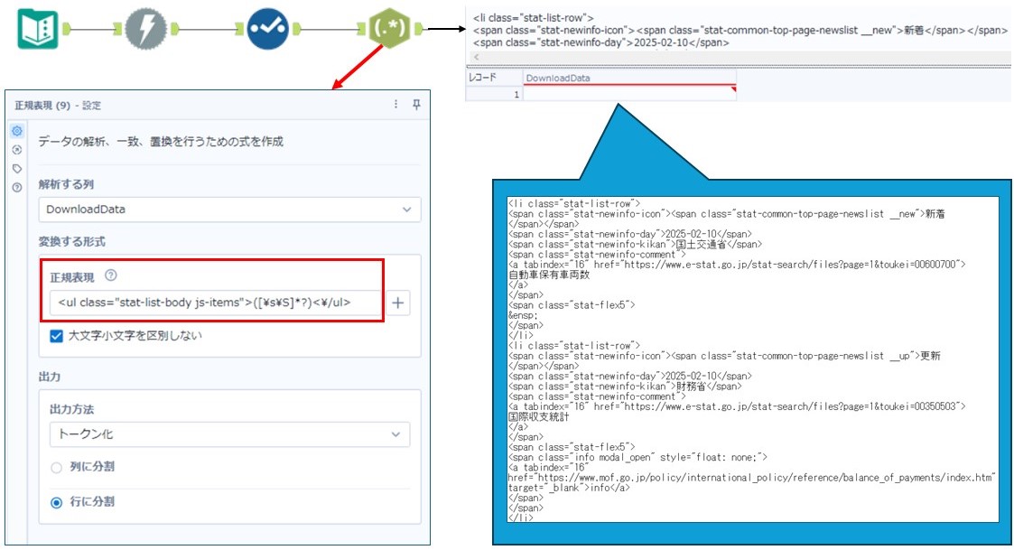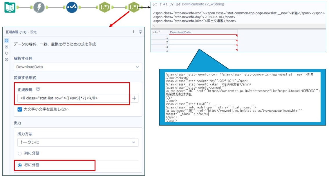 その後、レコードIDツール を使用して各行にIDを付与し、 <span> タグ内の [新規フラグ、更新日、組織、URL、内容] のデータを、それぞれの正規表現を使って抽出します。