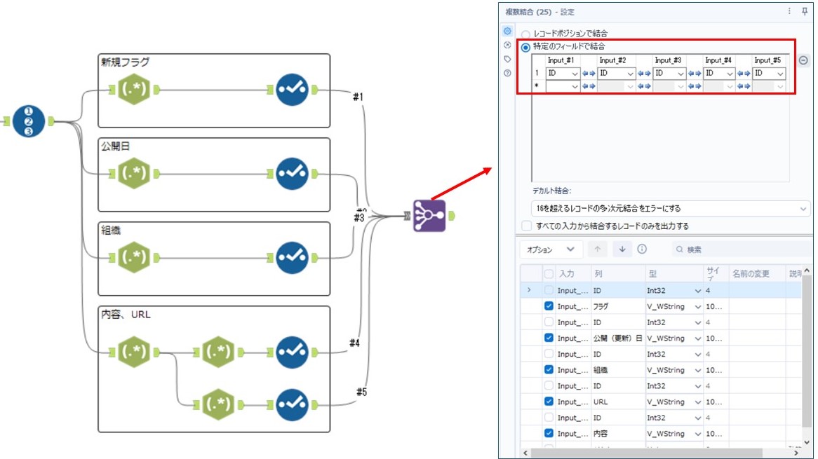 抽出が完了したら、複数結合ツール を使用して、IDフィールドを基準にデータを結合します。