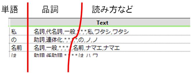 まずは出力されたデータを確認します。「単語」空白(Tab)「品詞」*,*,*,「読み方など」で出力されてます。まずは空白を利用してテキストパースしてみましょう。