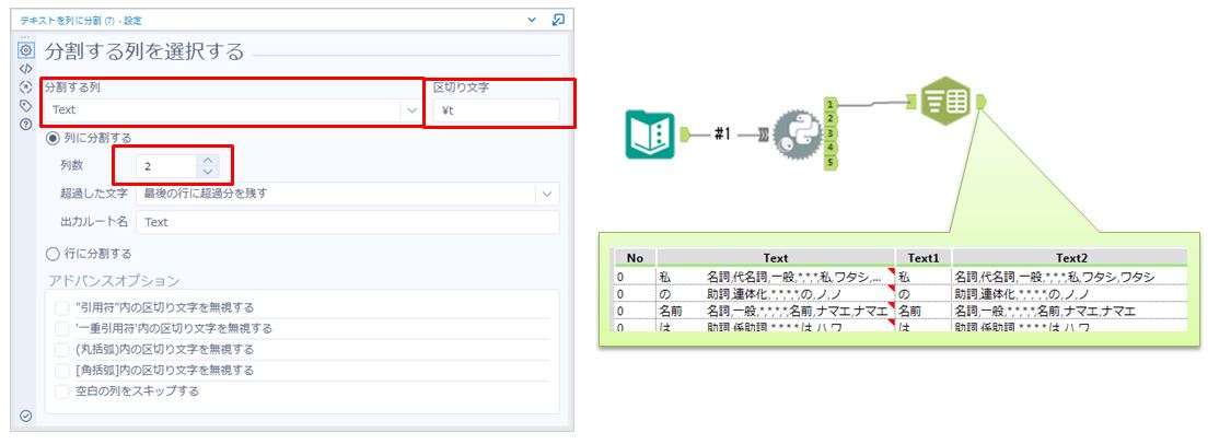 分割する列は「Text」区切り文字は「\t」(Tabによる空白)にします。分割する列数は「2」です。