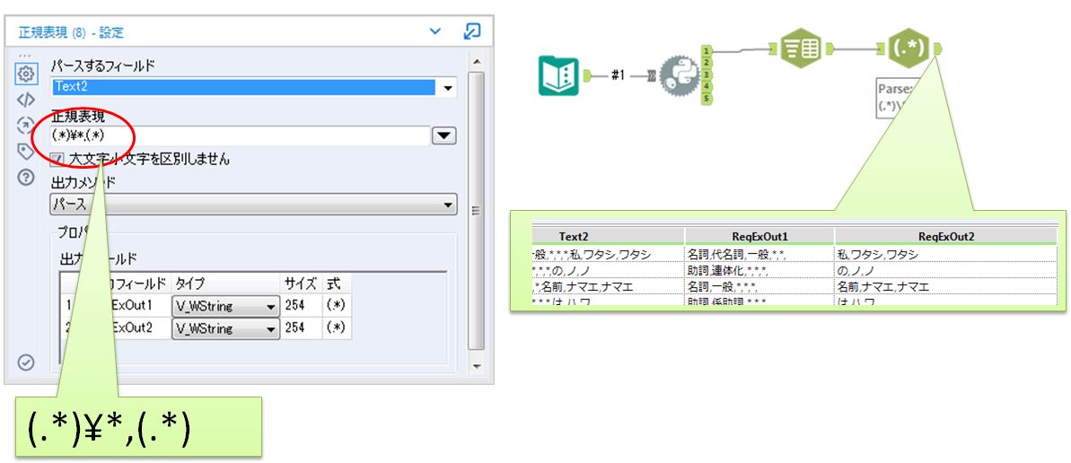 次に品詞と読み方を分割してみます。確認すると区切り文字が「,*」であることは分かりますが数が4つだったり5つだったりしています。このようなケースの場合は「正規表現」ツールなどがおすすめです。