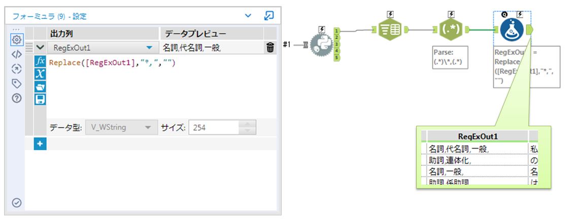 これで「品詞」と「読み方など」に分割できました。この状態だと品詞の部分に不要な「*,」が残ります。「フォーミュラ」ツールでReplace関数を使って修正します。