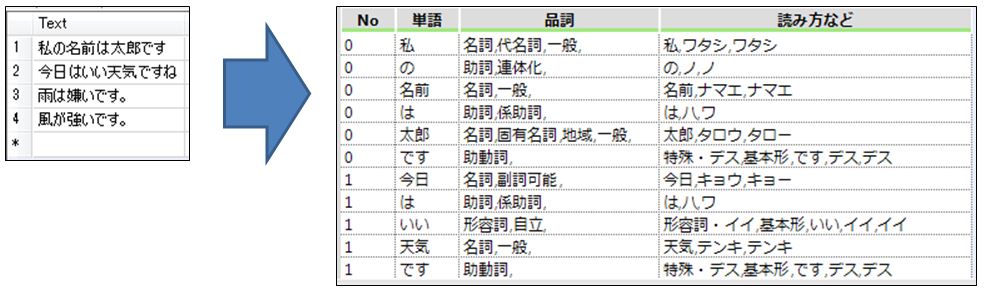 形態素解析とは自然言語処理の一種です。文章を形態素、言葉が意味を持つまとまりの単語の最小単位まで分解し、単語の品詞の種類、活用形などを解析します。