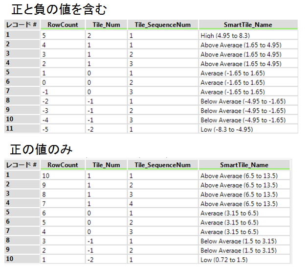 平均と標準偏差を用いてセット分けします。データが「正の値のみ」の時と「負と正を含む」の時で計算ロジックが異なります(Alteryxが自動的に判別します)。割り当てられたタイルは、レコードの値が平均範囲内か(=0)、平均を上回るか(1)、平均を下回るか(-1)などを示します。