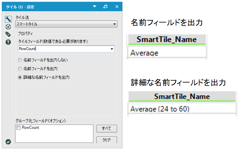 | 名前フィールドを出力 | 「SmartTile_Name」フィールドが追加されます。Average(平均)等の値が入ります(計算ロジックで説明する「SmartTile_Name」の項目が入ります)。 |