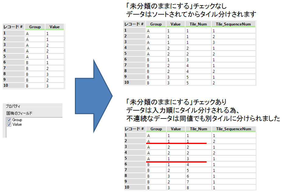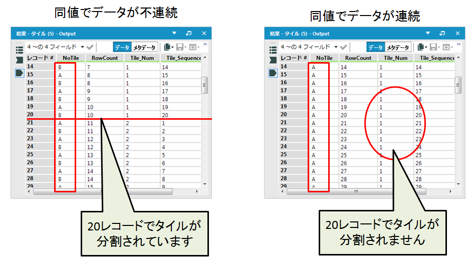 「NoTile」フィールドのレコードの並びを2種類用意してみました。1つは、AとBというレコードが交互に並んでいる場合。もうひとつは、Aが50レコード連続し、その後Bが50レコード連続しているケースです。