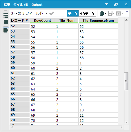 出力結果としては、どの方法でも「Tile_Num」「Tile_SequeceNum」の2フィールドが追加されます。