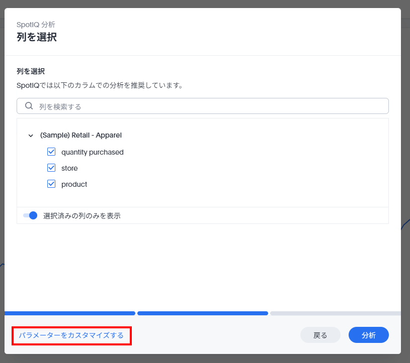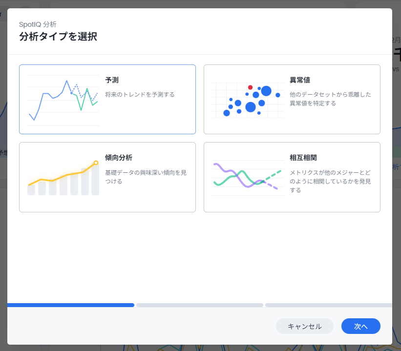 前述のSpotIQ分析のメニューからそれぞれのメニューを選択し、「次へ」ボタンをクリックすると、それぞれの分析を行うことができます。