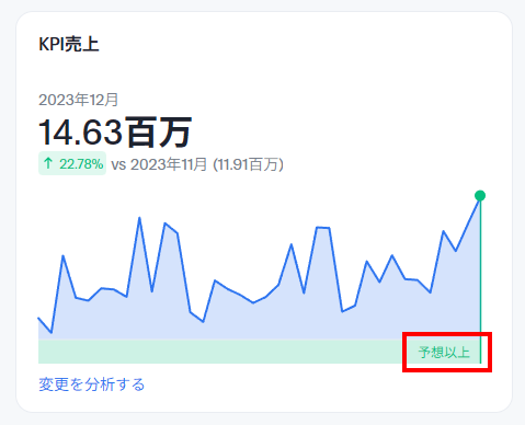 KPIチャートには異常値検出機能が最初から組み込まれています。過去のデータポイントに基づき、最新のデータポイントが期待される信頼区間に収まっていない場合、異常値として検出します。詳細はこちら