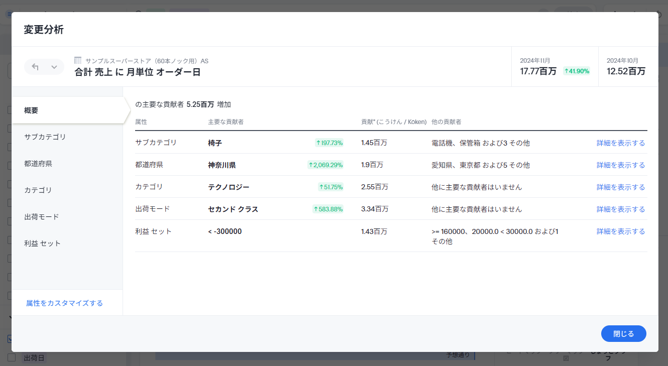 左のタブで各属性項目を切り替えると、それぞれの属性内の変化の要因を確認することができます。
