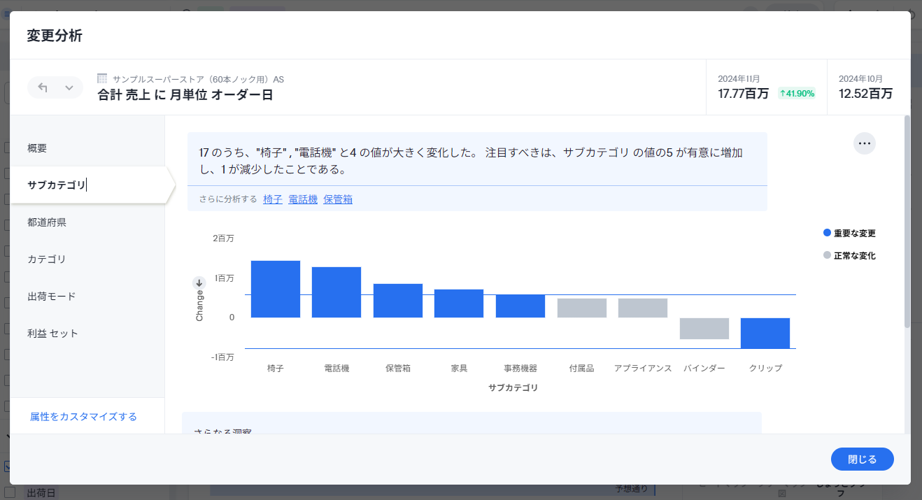 変更分析は、ある2点間の比較を行い、主要な変更要因を特定できる機能です。この機能は変化に対する主要要因を深堀りできる非常に便利な機能となっており、他のセルフサービスBIツールではここまで特化した機能を持っているものはないと思います。詳細なアルゴリズムなどを知りたい方はドキュメント を参照して下さい。