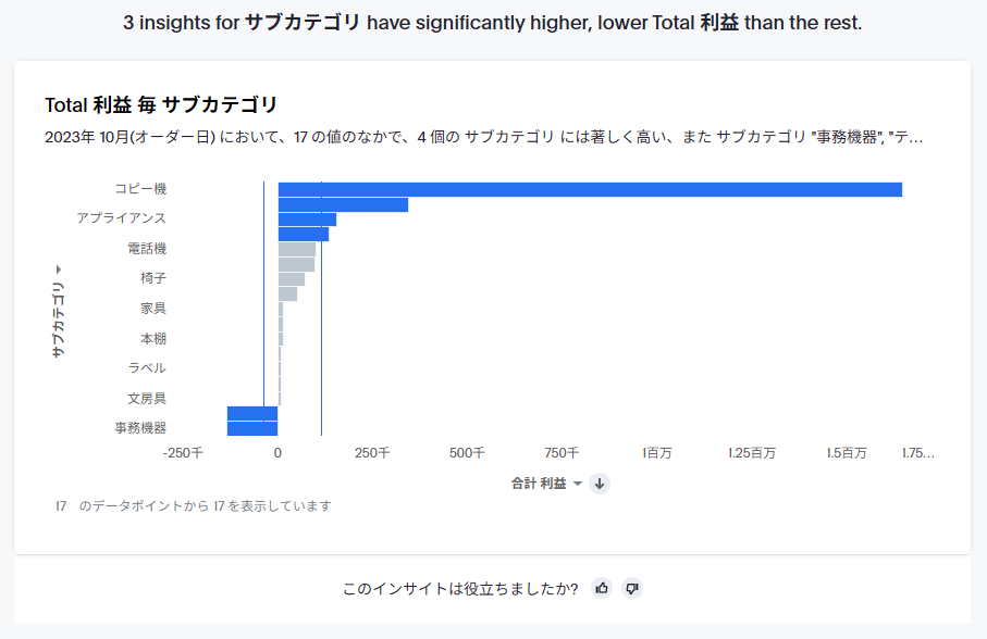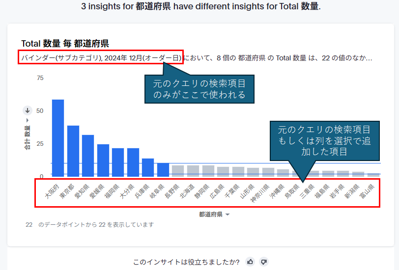 逆に、ユーザー側で分析範囲をコントロールしたい場合は、「分析を現在の結果セットに限定」というオプションをオンにすることで、分析の元となる検索結果の項目に限定して分析を行うことができるようになります。少しずつインサイトを探っていくにはこちらの方が確実かもしれません。