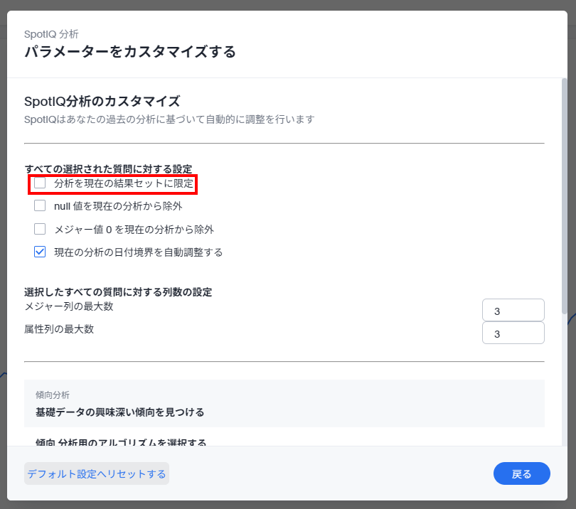 傾向分析で、検索トークンで設定している属性の傾向でインサイトが得られない場合、「パラメーターをカスタマイズする」のところで「分析を現在の結果セットに限定」にチェックを入れて実行してみてください。ただし、この場合「列を選択」で設定したメジャーについて分析が行われなくなるため、追加したいメジャーがある場合は検索トークンに加えてください(チャートに表示しなくても未使用項目に入れておけば分析対象となります)。