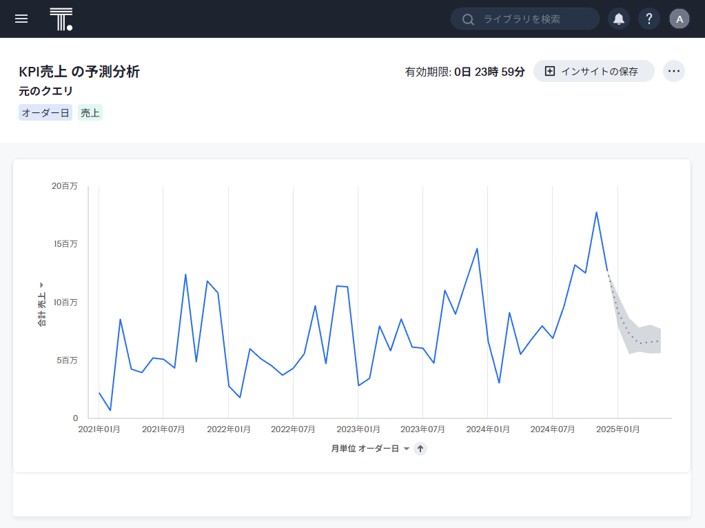 右端のグレー部分が予測の結果で、95%の信頼区間の予測結果となります。なお、予測するためには、データポイントが最低15個必要です。