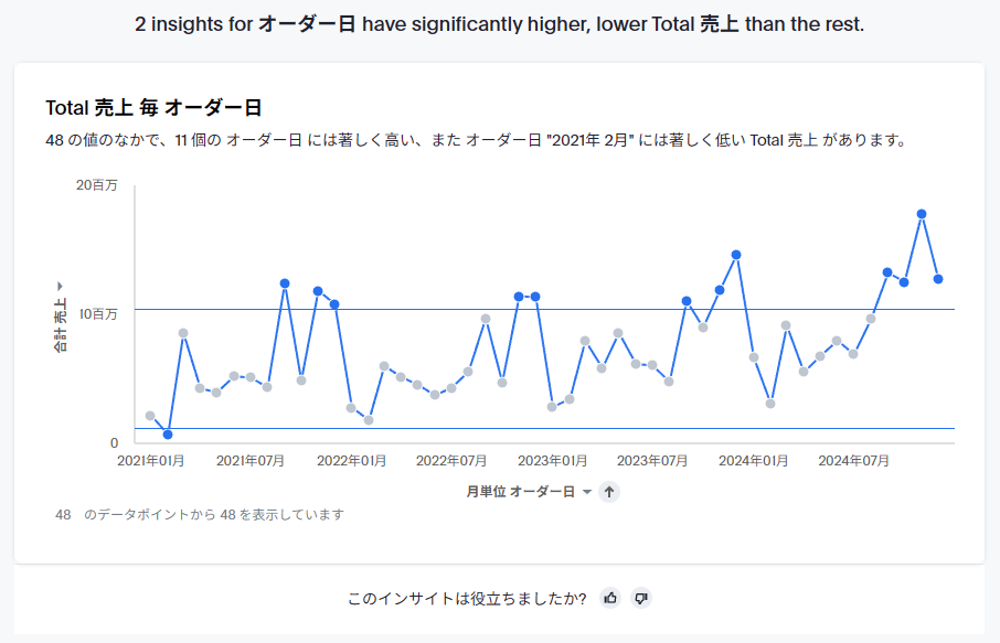 こちらは、月単位の日付項目に対して分析が行われています。アルゴリズムは「中央Zスコア」です。