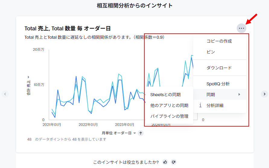 さらに、SpotIQで作成された各チャートはチャート内の3点メニューからライブボードへのピン留めやダウンロード、同期、分析の詳細の確認などができます。「コピーの作成」を行えば、チャートを自分でカスタマイズすることも可能です。