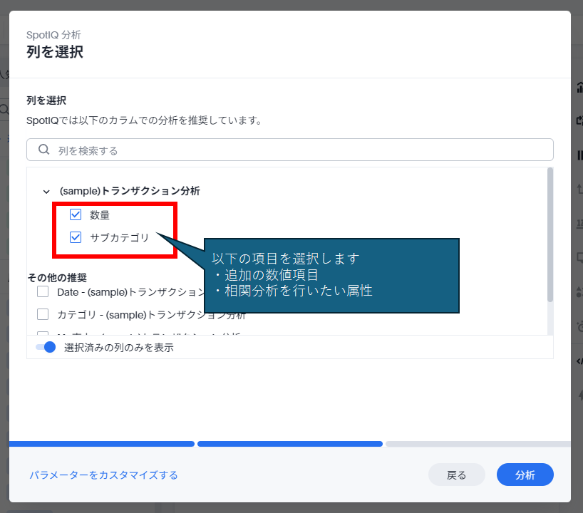 「列を選択」がポイントです。ここで、追加の数値項目と相関分析を行いたい属性を追加します。日付項目は選択しないでください。属性も1つにしてください(複数追加しても1つしか結果が出てきません)。