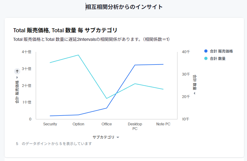 - 時系列データになれば良いので、日付項目と分析したい数値項目を複数入れたチャートを作成するだけです。元の属性は無視されるため、日付項目と相互相関を見たい数値項目が複数入ったチャートを作成し、相互相関分析を実行しましょう。