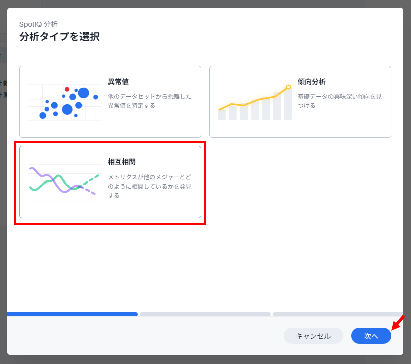 以下の分析タイプ選択画面で「相互相関」を選択し、「次へ」をクリックします。
