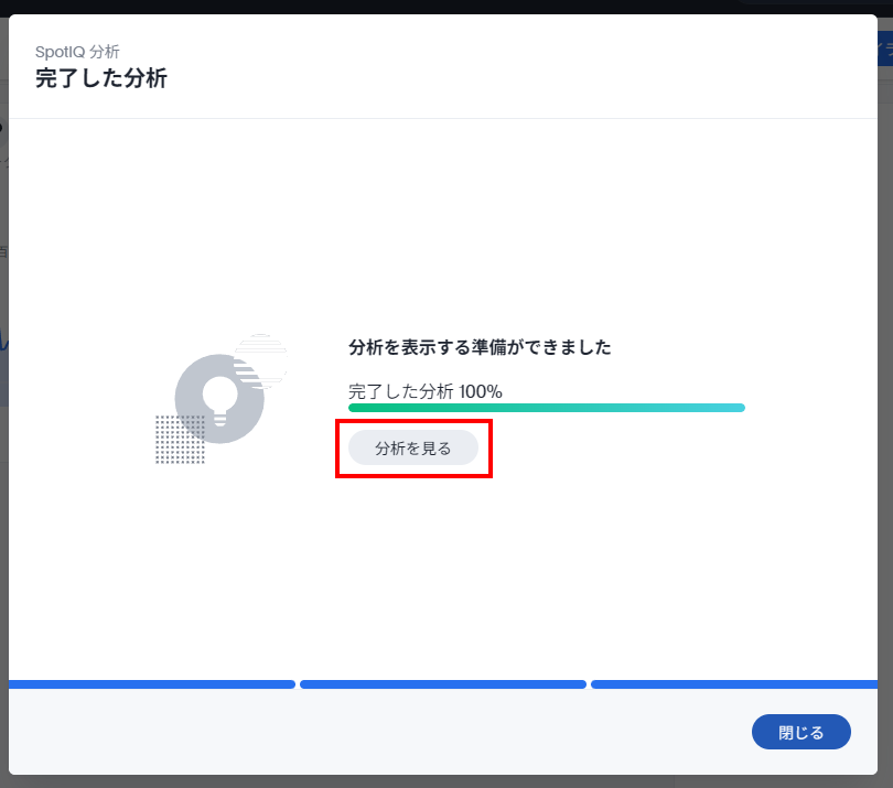 「分析」ボタンをクリックすると、分析が開始され、少しすると完了します。完了したら「分析を見る」ボタンが出てくるので、これをクリックしてください。