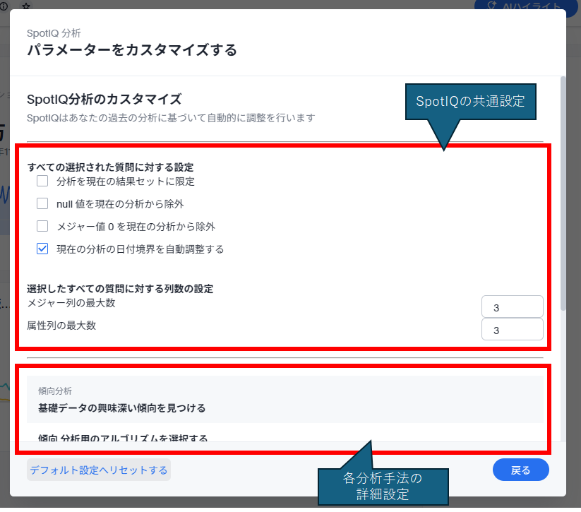 パラメータのカスタマイズ画面について見てみましょう。基本的に各機能共通のカスタマイズ設定と、各分析手法ごとの設定に分かれています。なお、この設定自体はワンショットの使い捨てになるのでご注意ください(ここで一度設定しても、再度SpotIQ分析を行う際、設定値はリセットされています)。