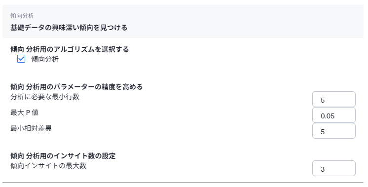 - 「傾向インサイトの最大数」が3に設定されているため、多くのインサイトが見つかってもデフォルト値の場合3つしか結果が出てきません。「傾向インサイトの最大数」は多めに設定することをおすすめします。