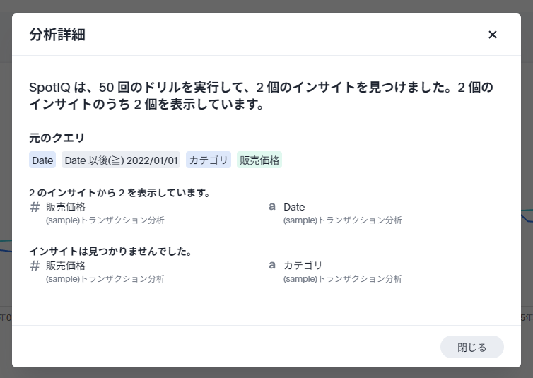 分析詳細は、分析を行った際にどのような組み合わせでインサイトを見つけたかを詳しく確認することができます。