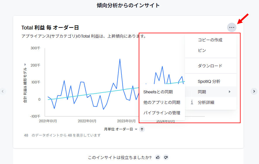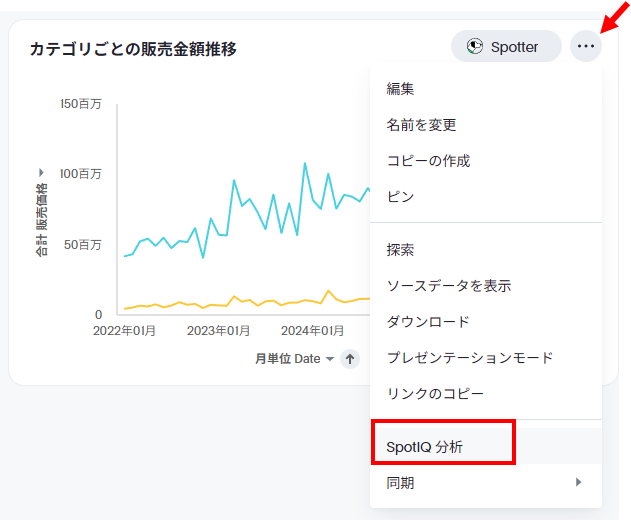 さらに、SpotIQで作成された各チャートはチャート内の3点メニューからライブボードへのピン留めやダウンロード、同期、分析の詳細の確認などができます。「コピーの作成」を行えば、チャートを自分でカスタマイズすることも可能です。