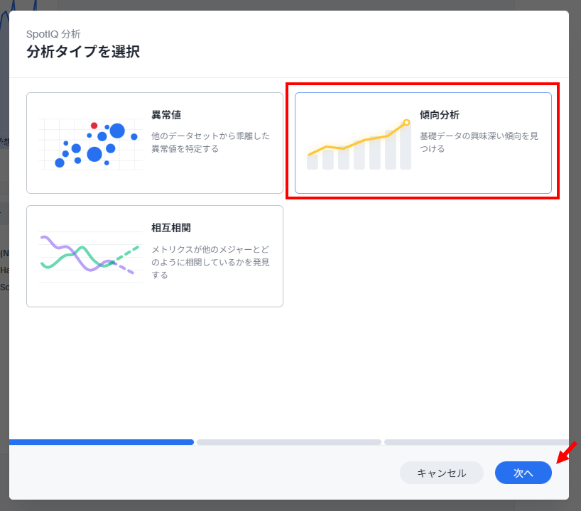 以下の分析タイプ選択画面で「傾向分析」を選択し、「次へ」をクリックします。