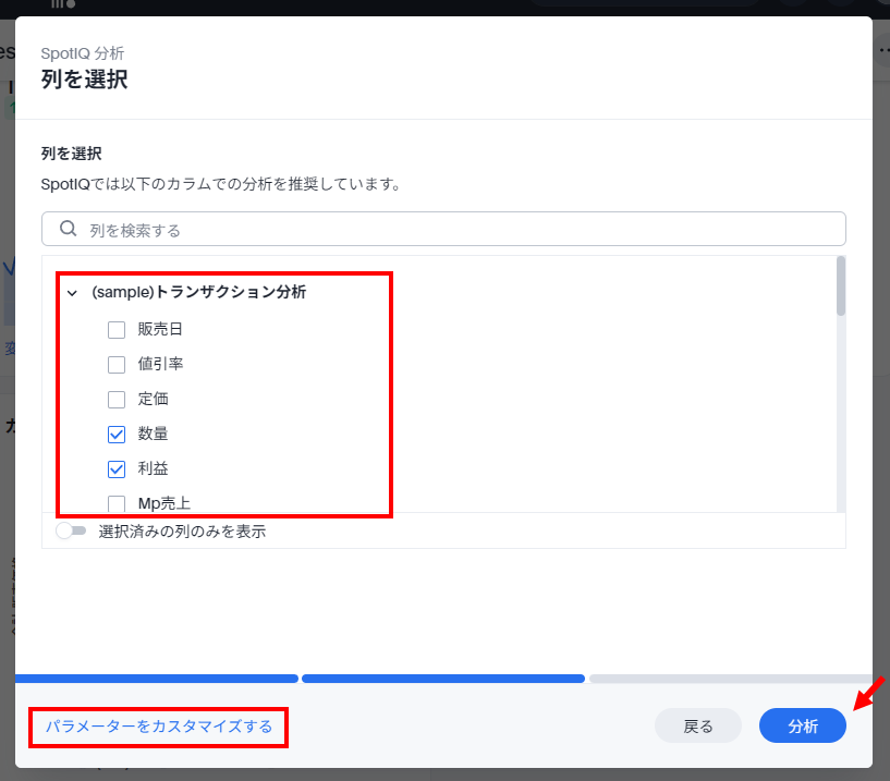 分析のカスタマイズは、どのようなオプションで分析を行ったのか確認できる機能です。