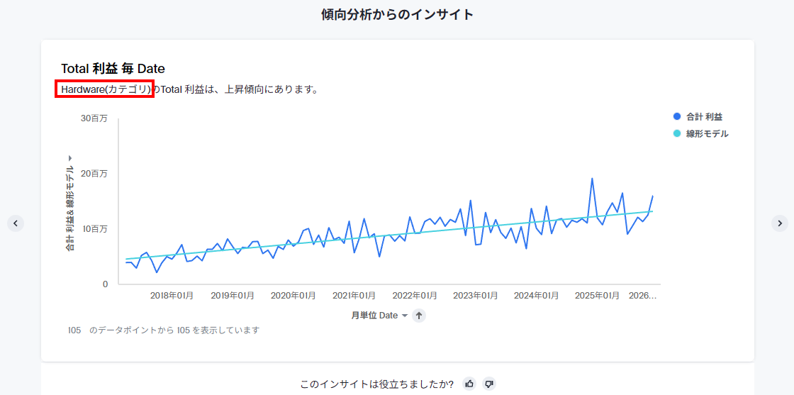 この分析詳細画面において、傾向分析の場合日付項目でしかインサイトが発見されないようになっています。