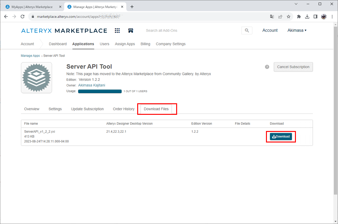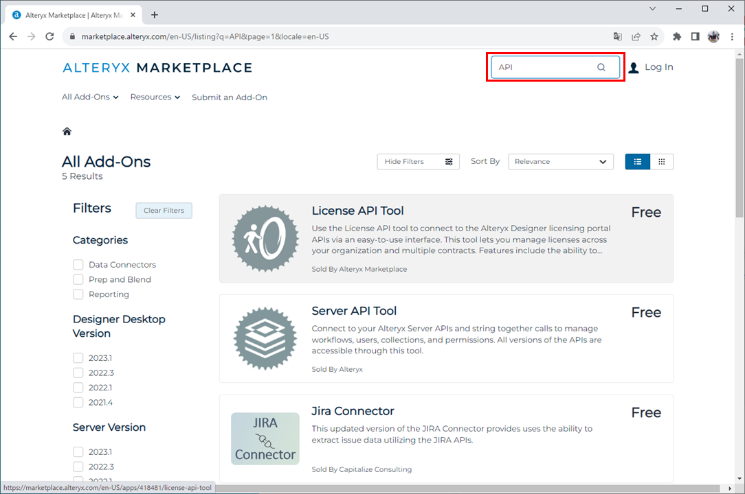 ここで入手可能なツール等は、Alteryx社が正式に検証したツールとなり、各提供者がサポートするようになりました。CommunityのGalleryはそのまま継続されますが、すでにGalleryにあったツールのうちいくつかはMarketplaceに移行されています。今まで無料で提供されていたものは、変わらず無料で提供されます。なお、2023年10月時点では言語は英語(アメリカ)のみの対応となっています。