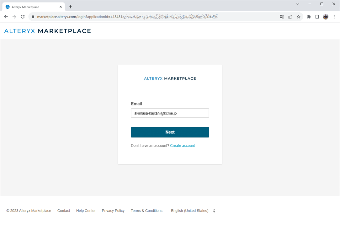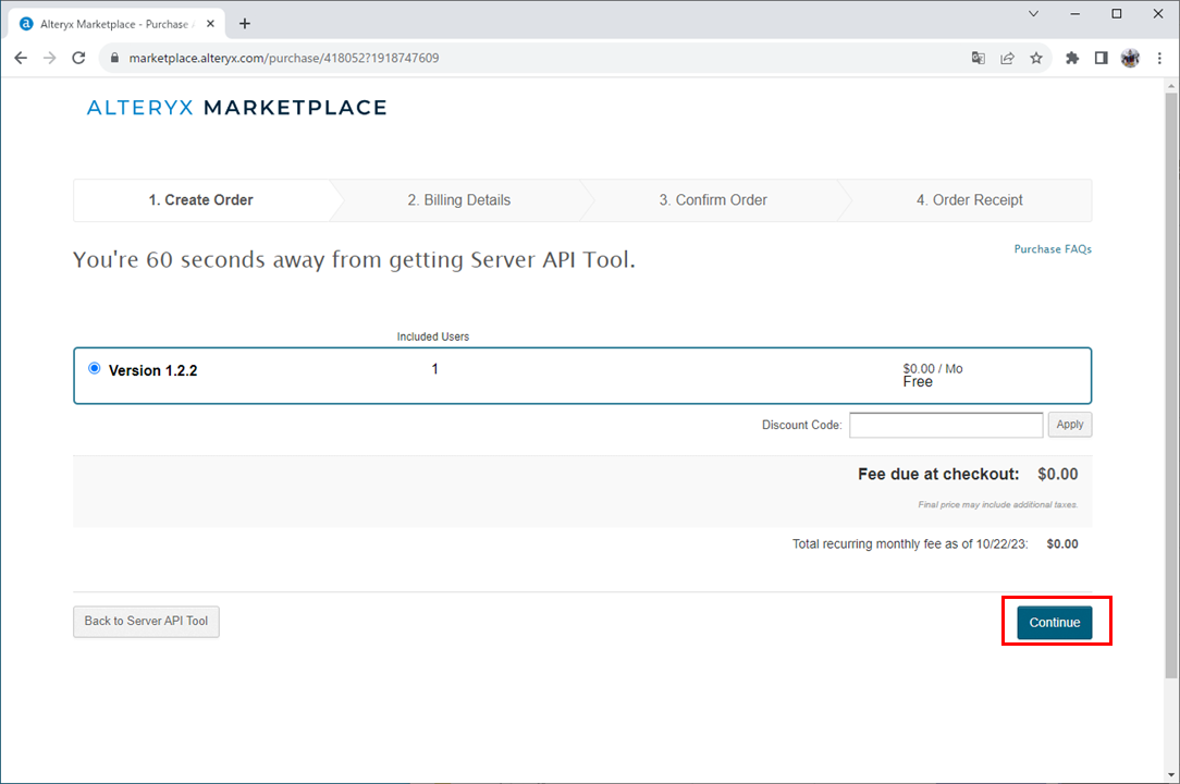 このあとAlteryxのSSOでログインが走ります(このあたりは将来的に変わる可能性もありそうですね)。その後、ようやく購入の画面に移ります。まずは「Continue」をクリックします。