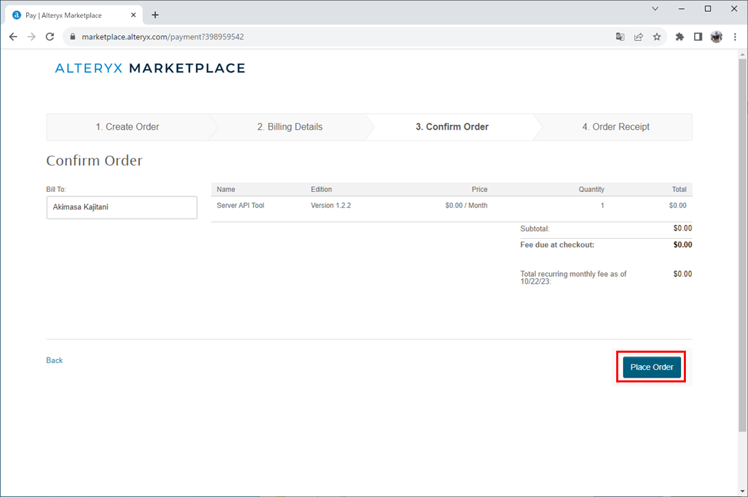 2の「Billing Details」は現時点ではすっとばされて、「Confirm Order」に遷移したので、このまま「Place Order」をクリックしましょう。