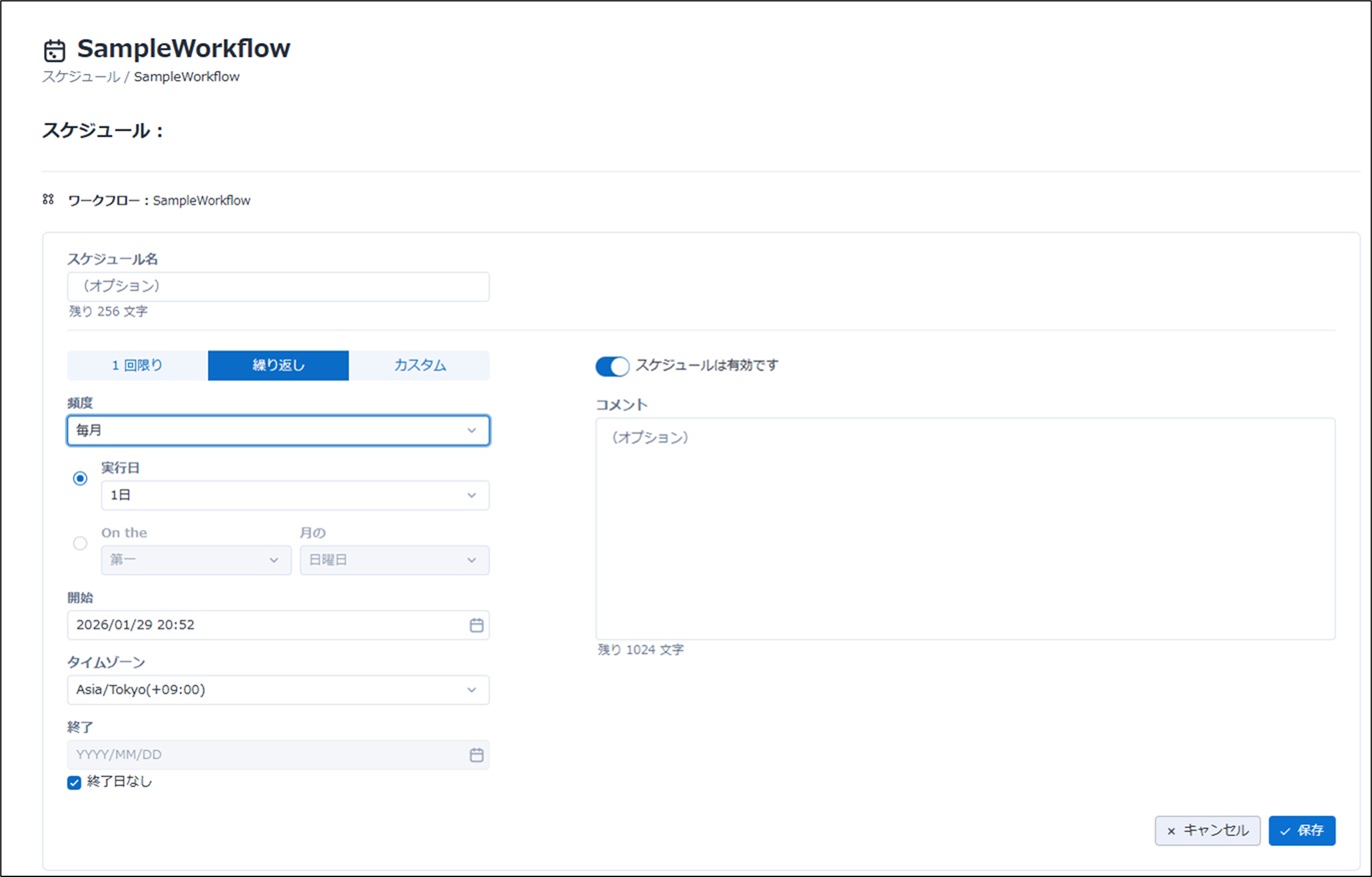 繰り返し、カスタムのスケジュールでは終了日を指定することが可能です。