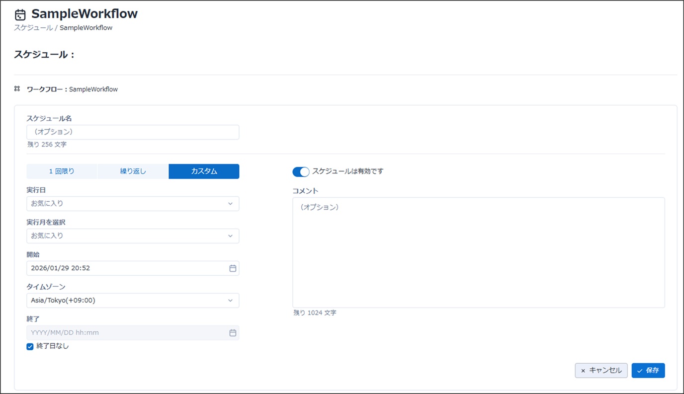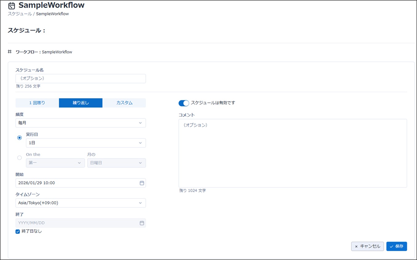 例えば2026年3月31日まで実行して、4月1日以降は実行したくない場合は終了日を指定しておくと4月1日以降スケジュールは実行されません。