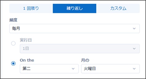 下記のように毎月第二火曜日に実行、という設定も可能です。