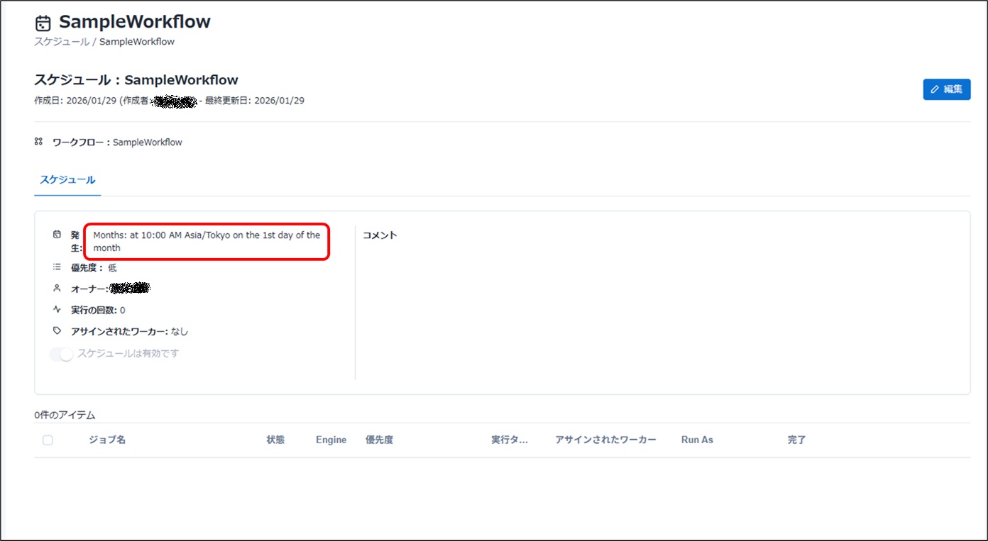 保存に成功すると下記のような画面に切り替わります。発生のところに登録したスケジュールの設定が表示されています。