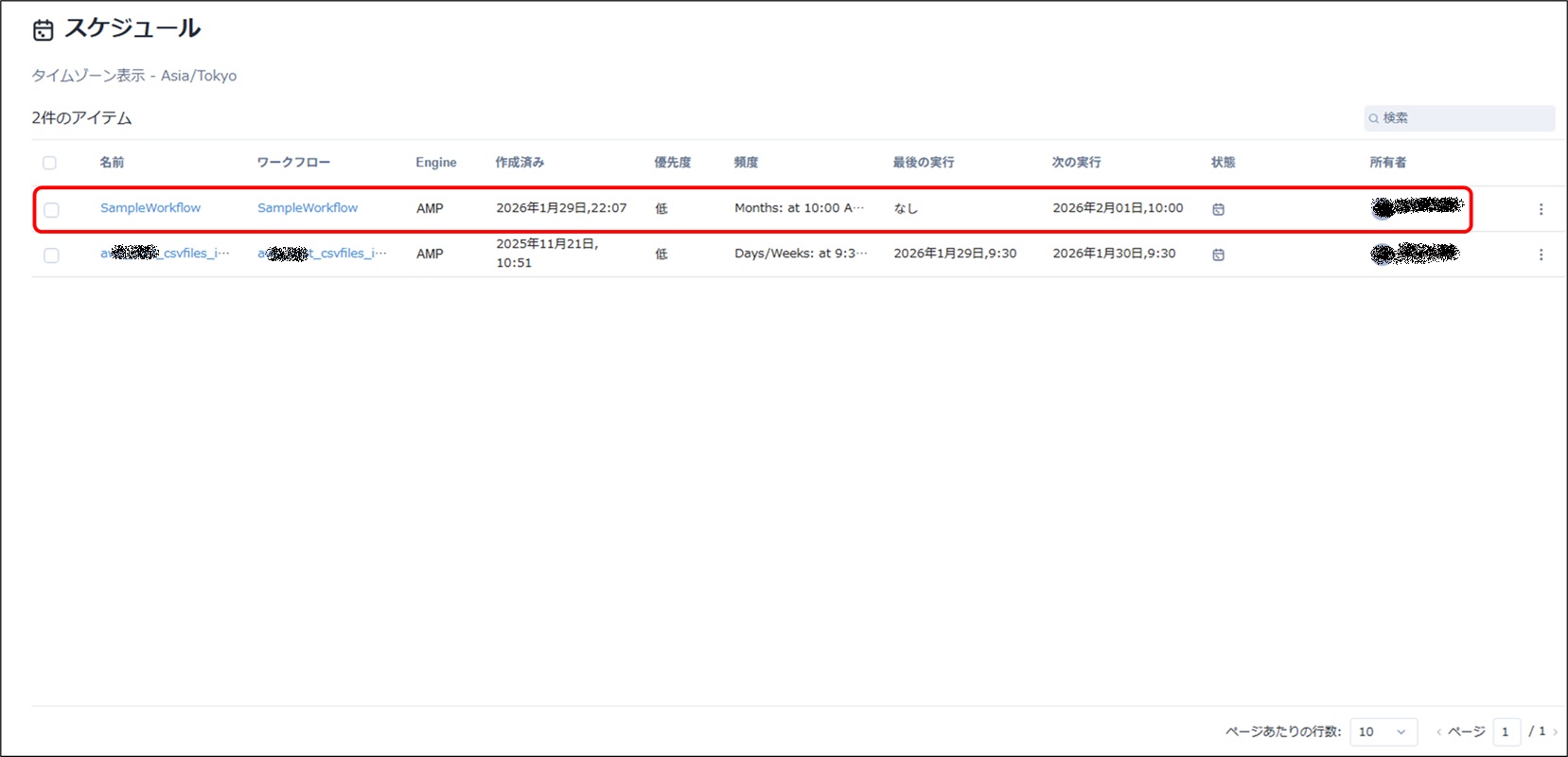 画面左側にあるメニューのスケジュールをクリックしてスケジュール画面を見るとリストに登録したスケジュールが表示されています。頻度、最後に実行された日時、次に実行される日時などがリスト上で確認できます。