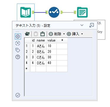 サンプルとして、以下のテキスト入力ツールのデータから、Primary Key付きDBテーブルを作成します。今回、Primary Keyはフィールド「id」に設定します。