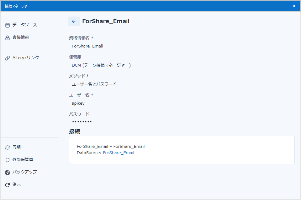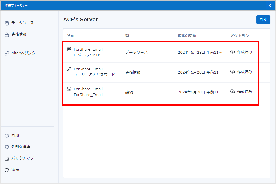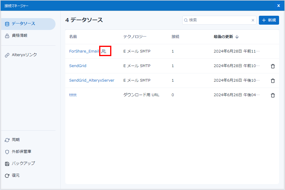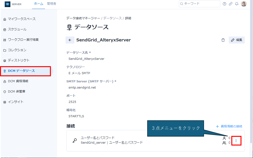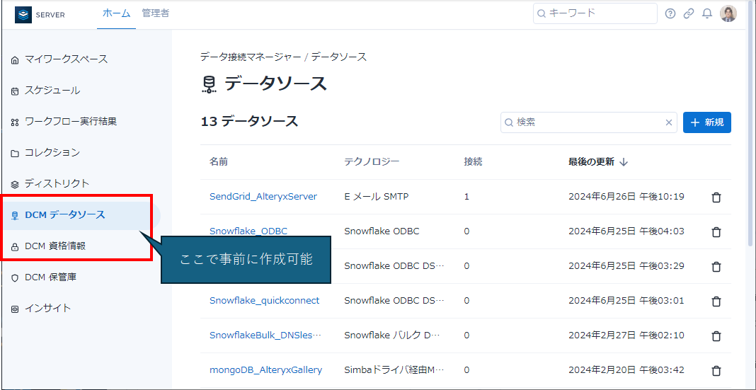Serverにおいて、各ユーザーのDCM設定はサイドバーのメニューの「DCMデータソース」「DCM資格情報」で確認ができます。ここには、Designerと同期したもの、Serverで作成したもの、いずれも見ることができます。